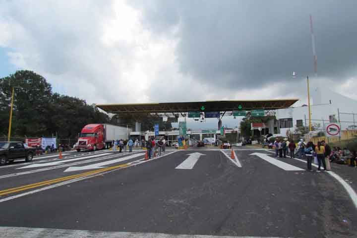 Maestros de la sección XVIII de la Coordinadora Nacional de Trabajadores de la Educación (CNTE) se manifiestan en las casetas de la autopistas siglo XXI y de occidente de Panindícuaro a Contepec, como parte de las acciones de lucha contra la reforma educativa y dentro del marco del paro indefinido de labores que este jueves cumple su cuarto día.