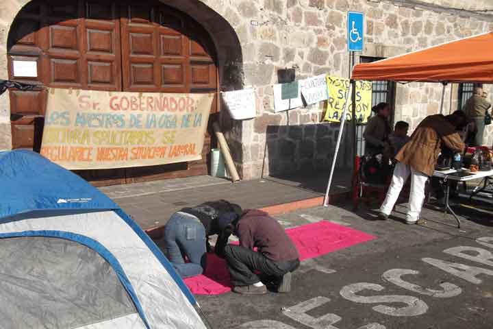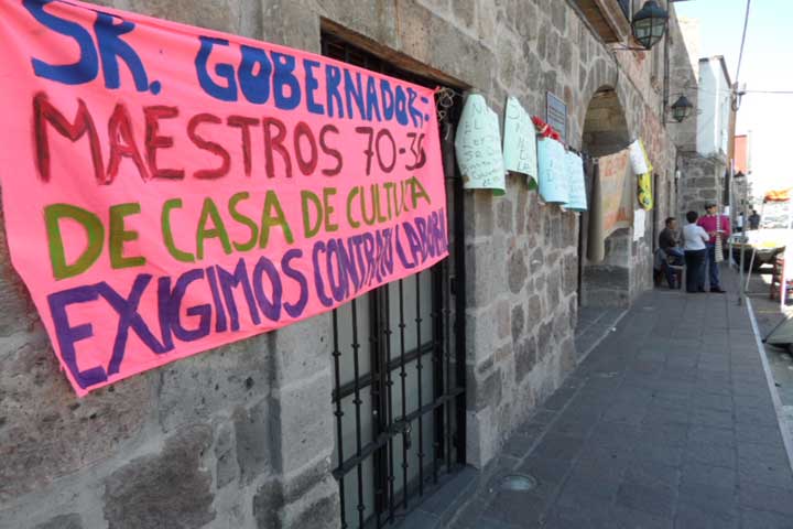 Maestros de la categoría 70 - 30 de la Casa de la Cultura tomaron dicho espacio para exigir un contrato formal y prestaciones, ya que aseguran hay personal que desde hace años no se le ha regularizado su situación laboral.