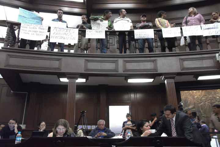 Ante la negativa de ser atendidos, ex empleados de confianza despedidos de la Auditoría Superior de Michoacán, presuntamente por organizarse a fin de sindicalizarse, se manifiestan con pancartas desde el segundo piso del Congreso del Estado.