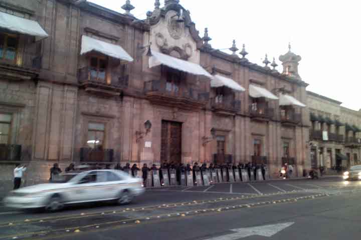 Elementos de la Policía Estatal Preventiva resguardan Palacio de Gobierno, toda vez que un grupo de manifestantes de Santa Fe de la Laguna se encuentran frente a dicho recinto.