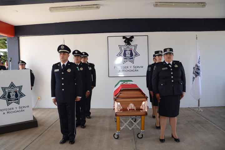 El oficial de la Policía Estatal Preventiva (PEP), Jesús Alberto Fonseca Saucedo, fue despedido en una ceremonia luctuosa con honores, en un acto protocolario encabezado por el subsecretario de Prevención y Reinserción Social, comisario jefe, Manuel Alejandro Lluch García, quien fungió como