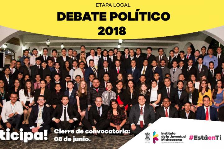 NOTICIAS 23/03/2018Presentan convocatoria del Concurso Juvenil de Debate Político 2018 A fin de promover la expresión responsable entre las y los jóvenes, el Instituto Mexicano de la Juventud (IMJUVE), a través del Instituto de la Juventud Michoacana (IJUMICH) y la Junta Local Ejecutiva del Instituto Nacional Electoral en Michoacán lanzaron la convocatoria del Concurso Juvenil Debate Político 2018.