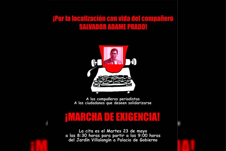 Periodistas y trabajadores de medios de comunicación que desempeñamos nuestra labor en Michoacán, exigimos a las autoridades efectividad en las acciones e investigaciones realizadas en torno a la desaparición del compañero Salvador Adame Prado, propietario del Canal 6TV del municipio de Múgica, suscitada el pasado jueves 18 de mayo.