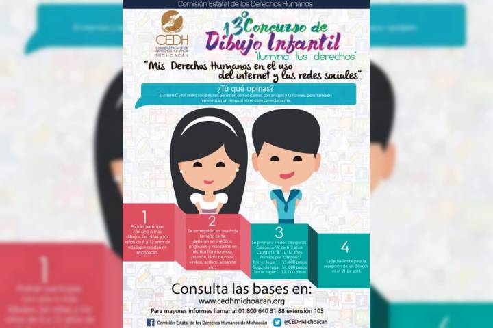 NOTICIAS 24/04/2017CEDH amplía plazo del concurso de dibujoLa Comisión Estatal de los Derechos Humanos (CEDH) determinó ampliar el plazo del 13º Concurso de Dibujo Infantil "Ilumina tus Derechos" que este año tiene como tema: "Mis derechos humanos en el uso del internet y las redes sociales, por lo que se invita a las niñas y los niños de seis a 12 años a participar.