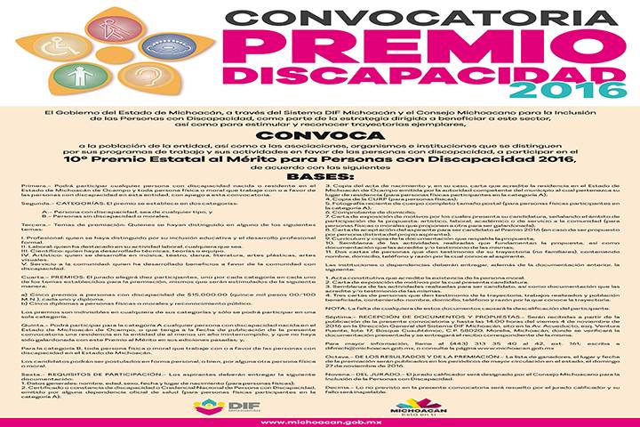 El Gobierno del Estado de Michoacán a través del Sistema para el Desarrollo Integral de la Familia (DIF) Michoacán y el Consejo Michoacano para la Inclusión de las Personas con Discapacidad invitan a participar en el 10° Premio Estatal al Mérito para Personas con Discapacidad 2016. Rocío Beamonte Romero, directora General del Sistema DIF Michoacán refirió que este año se establecen dos categorías para participar: personas con disc...
