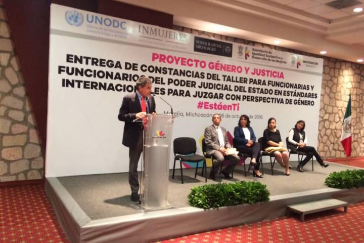 NOTICIAS 06/10/2016Reconoce UNODC trabajo del Gobierno de Michoacán para erradicar la violencia contra las mujeres Derivado del convenio signado entre el Gobierno del Estado y la Oficina de las Naciones Unidas contra la Droga y el Delito (UNODC, por sus siglas en inglés) en México, concluyó la primera capacitación con estándares internacionales para juzgar con perspectiva de género, brindado a 123 juezas, jueces y funcionarios del Poder Judicial del estado.