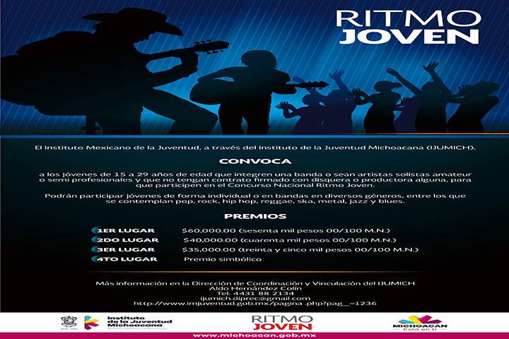 NOTICIAS 13/07/2016Convoca IJUMICH al concurso nacional Ritmo Joven 2016El Instituto de la Juventud Michoacana (IJUMICH) convoca a jóvenes de 15 a 29 años de edad que integren una banda o sean artistas amateur o semi profesionales y que no tengan contrato firmado con alguna disquera o productora a participar en el concurso nacional Ritmo Joven 2016, organizado por el Instituto Mexicano de la Juventud (IMJUVE).