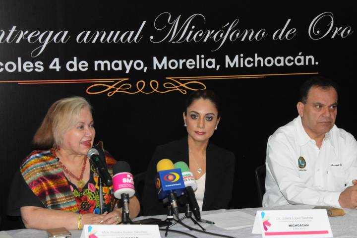 NOTICIAS 03/05/2016Grandes personalidades y artistas engalanarán la magna entrega del Micrófono de Oro Con decenasde artistas en escena, la magna entrega del Micrófono de Oro 2016, que se llevará a cabomañana miércoles en el Foro Cultural de la Expo Fiesta Michoacán, promete ser la mejor edición en décadas, toda vez que se tiene confirmada la presencia de celebridades de la talla de Rosa Gloria Chagoyán, Jorge Falcón, Nora Velázquez La Chavelita, Roxana Chávez, Sugey Ábrego y Aida Pierce, entre muchos otros.