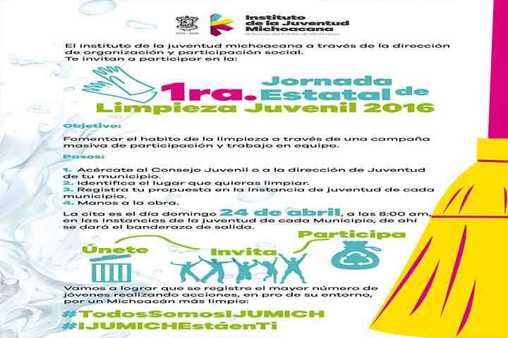 Con la finalidad de fomentar el hábito de la limpieza a través de una campaña masiva de participación y trabajo en equipo, el Instituto de la Juventud Michoacana (IJUMICH), a través de la Dirección de Organización y Participación Social, emitió la convocatoria para la Primera Jornada Estatal de Limpieza Juvenil 2016, que se realizará el próximo 24 de abril.