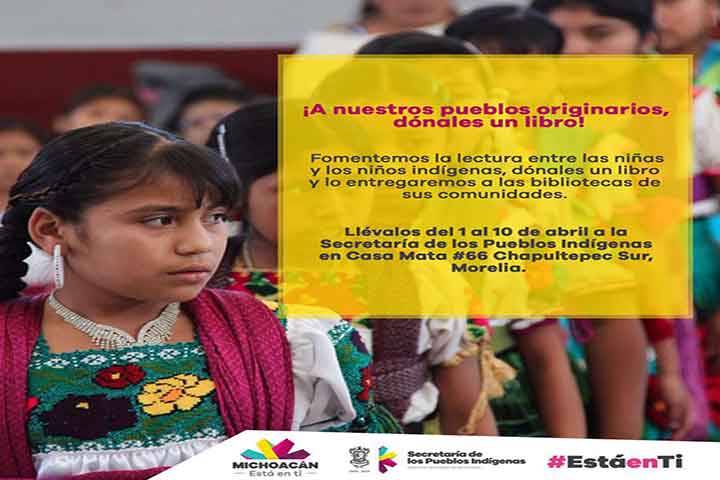 La Secretaría de los Pueblos Indígenas del Estado (SPI), convoca a todos los ciudadanos que deseen sumarse a llevar mejores herramientas de vida a niños y niñas de los pueblos originarios de Michoacán, mediante la donación de un libro, con el reto de fortalecer las bibliotecas de cada una de las 449 localidades originarias que existen en nuestra entidad.
