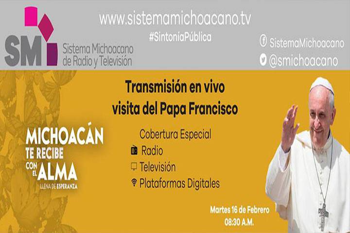 NOTICIAS 14/02/2016El SMRTV hará transmisión especial con motivo de la visita del Papa El Sistema Michoacano de Radio y Televisión (SMRTV), Sintonía Pública, realizará un despliegue técnico y humano para presentar una importate cobertura de la visita del Papa Francisco a Morelia, el próximo 16 de febrero, desde una perspectiva laica y acorde al marco normativo que rige a la institución.