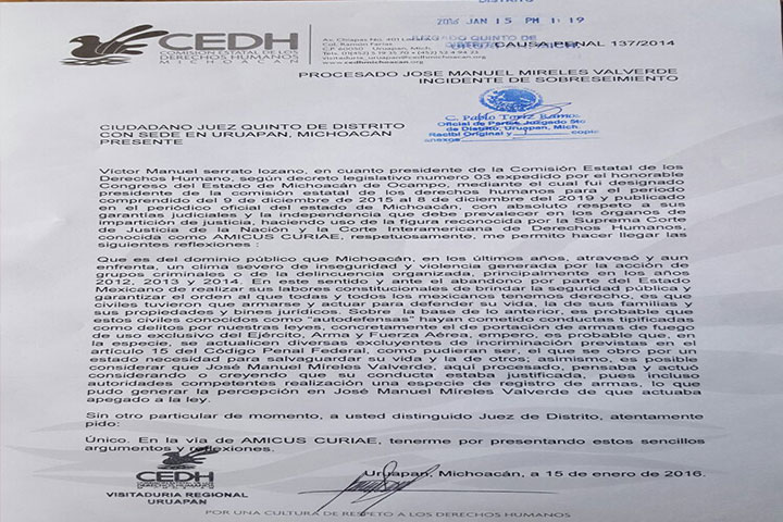 NOTICIAS 15/01/2016Promueve CEDH figura jurídica Amicus Curiae para la defensa de MirelesEl Ombudsman michoacano, Víctor Manuel Serrato Lozano, presentó escrito en el que promueve la figura jurídica Amicus Curiae; a través del cual pide a la autoridad competente que al momento de resolver sobre el caso de José Manuel Mireles Valverde, se tome en cuenta el contexto de inseguridad, violencia, asesinatos, secuestros, violaciones y extorsiones en que se vio envuelto Michoacán.