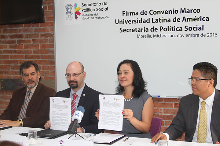 NOTICIAS 26/11/2015Sepsol y la UNLA firman convenio de colaboración institucional La Secretaría de Política Social (Sepsol) y la Universidad Latina de América (UNLA), signaron un convenio marco de colaboración que tiene como objetivo principal vincular al estudiantado a través del servicio social de verano con los programas sociales que ejecuta la Sepsol, concretamente en lo que respecta a Fortalecimiento Comunitario, a través del cual se trabaja directamente con la gente de las comunidades del Estado.