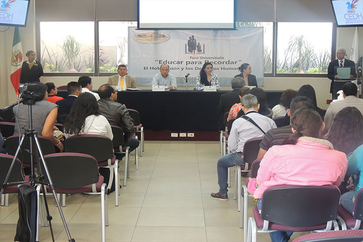 NOTICIAS 18/11/2015Se realiza el foro universitario "Educar para recordar"El ombudsman michoacano, José María Cázares Solórzano, presidió este miércoles el Foro Universitario "Educar para recordar", organizado por la Embajada Mundial de Activistas por la Paz, que tuvo como sede el auditorio de la Comisión Estatal de los Derechos Humanos (CEDH) y cuyo tema central fue El Holocausto.
