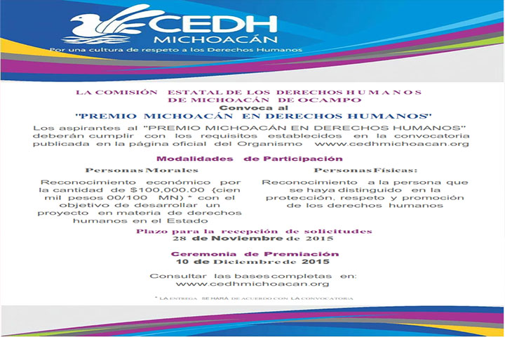 NOTICIAS 30/10/2015Abre CEDH convocatoria para el "Premio Michoacán en Derechos Humanos"La Comisión Estatal de los Derechos Humanos (CEDH) abrió la convocatoria para el "Premio Michoacán en Derechos Humanos", en reconocimiento a las personas físicas y morales que se destaquen por sus aportaciones en la protección, respeto y promoción de los derechos humanos, primordialmente en el Estado de Michoacán.
