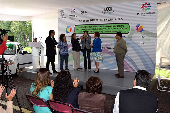 NOTICIAS 06/07/2015DIF realiza "Sorteo 2015"Catherine Ettinger de Jara, presidenta del Sistema para el Desarrollo Integral de la Familia (DIF) Michoacán, en compañía de la directora general, Mariana Sosa Olmeda, realizaron el "Sorteo 2015, Instalación para Parques Temáticos para Personas con Discapacidad en el Parque Zoológico Benito Juárez".