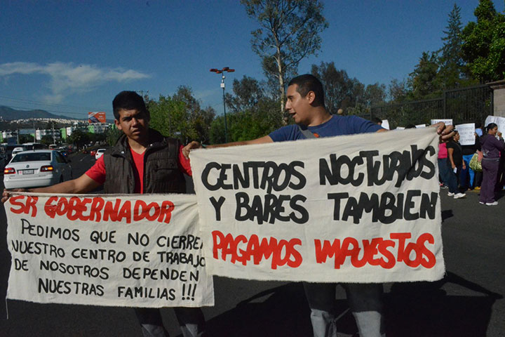 Un gran número de personas que viven de los empleos de los centros nocturnos, encabezadas por los dueños de los mismos bares, se manifestaron la mañana de este lunes, con la exigencia de que el gobernador, Salvador Jara Guerrero, detenga los constantes operativos realizados por la Procuraduría General de Justicia del Estado (PGJE), pues dijeron que éstos han sido arbitrarios y con "siembra" de pruebas.