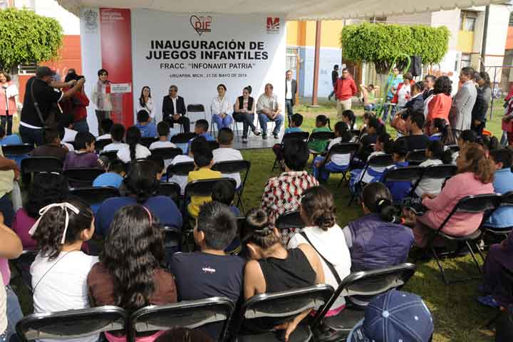 La presidenta del Sistema para el Desarrollo Integral de la Familia (DIF) Michoacán, Patricia Mora de Vallejo, hizo entrega de un módulo de juegos infantiles en beneficio de los vecinos de la colonia Infonavit Patria de Uruapan, con lo dio cumplimiento a uno más de los compromisos del gobernador Fausto Vallejo Figueroa.