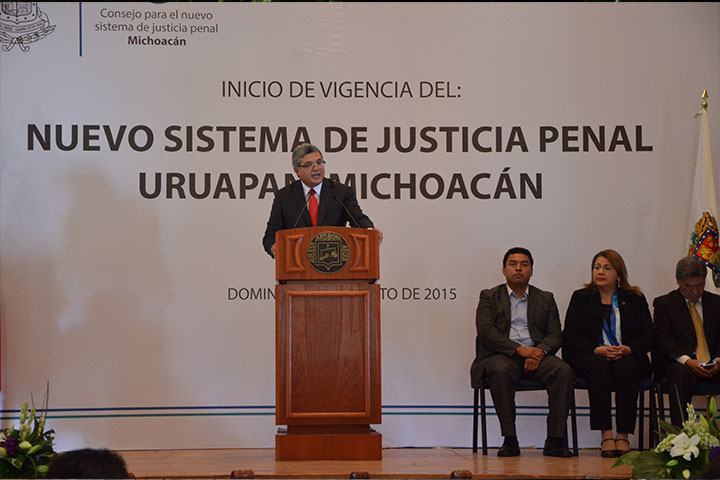 Los titulares de los Poderes Ejecutivo, Legislativo y Judicial, Salvador Jara Guerrero, Sarbelio Molina Vélez y Juan Antonio Magaña de la Mora, respectivamente, dieron el martillazo de inicio a la implementación del Nuevo Sistema de Justicia Penal que este lunes entra en vigor en Uruapan, región que integra a 18 municipios donde cobran vigencia los juicios orales.