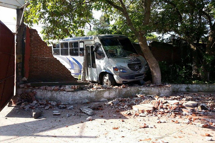 Un chofer de la línea de camiones "Colectivos" descendió de su unidad, la dejó prendida, pero olvidó ponerle el freno para que quedara detenida, momento en que ésta se proyectó contra una barda de la Escuela Secundaria Federal Número 3 y la tumbó sin que por fortuna hubiera víctimas humanas que lamentar.