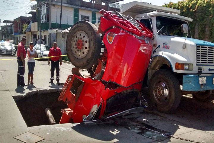Un camión tipo volteo que transportaba arena, literalmente fue tragado por la tierra al hundirse sobre la calle de Ricardo Flores Magón de la colonia El Periodista, frente a la Central de Autobuses, el chofer y un acompañante sufrieron golpes leves. El accidente sobrevino al abrirse un enorme socavón de unos de cuatro metros de profundidad y un diámetro de 8 metros.
