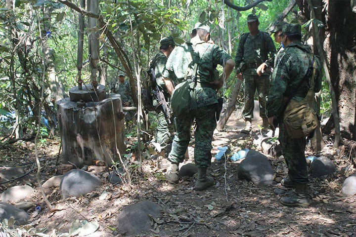 En una reciente movilización, el Ejército Mexicano destruyó dos narcolaboratorios más en esta región de la Tierra Caliente, ahora en este municipio de Parácuaro, uno de ellos ubicado a un costado de un camino rural y otro en una barranca, con lo cual la milicia lleva en lo que va del año al menos siete de estas narcococinas echadas abajo en esta zona de la entidad.