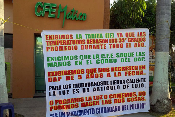 Integrantes de las asociaciones civiles Unidos por el Bienestar de Tierra Caliente y del Consejo Ccristos de Apatzingán, "tomaron" este lunes las instalaciones de la Comisión Federal de Electricidad en esta ciudad, para reiterar su exigencia de que se anule el derecho de alumbrado público (DAP), y reclamar un cambio de tarifas acordes a la zona cálida en que vivimos para abaratar los costos del servicio eléctrico en beneficio de miles de u... Ver más...