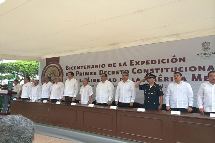 Con la firma del libro de visitas de la casa donde fue promulgado el histórico documento el 22 de octubre de 1814, el gobernador de Michoacán Salvador Jara Guerrero, dio apertura a los festejos por el Bicentenario de la Constitución de Apatzingán de 1814, junto con los titulares de los Poderes Legislativo y Judicial de la entidad.