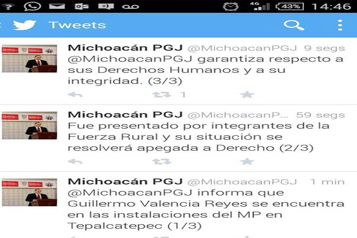 NOTICIAS 08/10/2014Memo Valencia se encuentra en el MP de Tepalcatepec, informa la PGJEEl ex presidente municipal de Tepalcatepec, Guillermo Valencia Reyes, se encuentra en las instalaciones del Ministerio Público de ese municipio, informó la Procuraduría General de Justicia del Estado a través de su cuenta de twitter @PJEMichoacán.