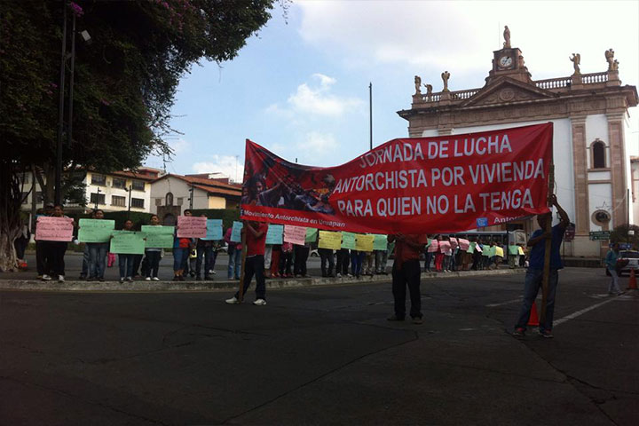 Ante la actitud impolular del Presidente Municipal, Aldo Macías Alejandres, respecto a la entrega de un terreno para que humildes ciudadanos de Uruapan pudiesen gestionar un proyecto de pies de casa ante la Secretaría de Desarrollo Agrartio, Territorial y Urbano (SEDATU), este jueves se manifestaron 1,500 antorchistas por diversos lugares de la ciudad.