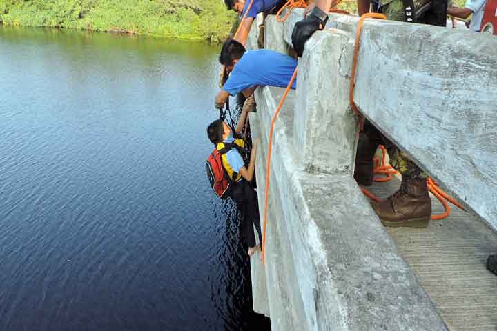 Dos estudiantes de la Escuela Secundaria Técnica número 134 de Acalpican, perteneciente a Lázaro Cárdenas, cayeron al hábitat de los cocodrilos cuando brincaron el puente para ganarle a sus compañeros pero no alcanzaron tierra, provocando pánico entre sus demás compañeros y su maestro ante el temor de que fueran atacados por los reptiles.