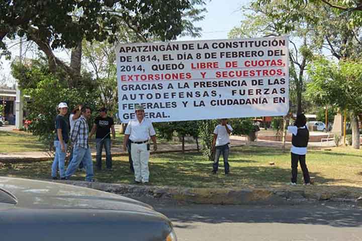 A través de mantas que colocaron en todos los puntos de acceso a esta ciudad, los grupos de autodefensa declararon a Apatzingán "Libre de cuotas, extorsiones y secuestros".