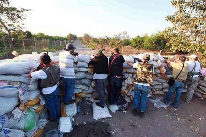 Parte de un grupo de Autodefensas que mantiene el control de la seguridad en la región de Tancítaro, avanzó a la comunidad de Jucutácato, perteneciente al municipio de Uruapan, donde comenzaron a colocar barricadas con costales de arena en los principales accesos.