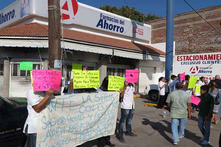 Una treintena de empleados de Farmacias del Ahorro se manifestaron hoy en esta ciudad de Apatzingán, para exigir ayuda al gobierno federal y estatal para restaurar su empresa, al depender de ello que puedan volver a trabajar y obtener ingresos para mantener a sus familias.