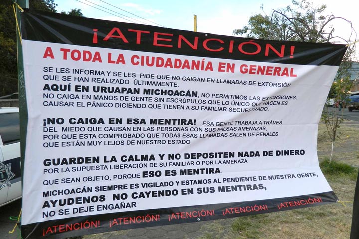 Varias mantas que advierten a la ciudadanía de no hacer caso de las extorsiones telefónicas -supuestamente hechas por delincuentes de otros estados- fueron colocadas en diferentes puntos de Uruapan, por personas desconocidas.