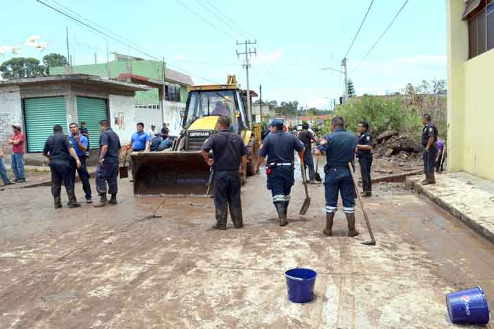 Un torrencial aguacero cayó la tarde de éste jueves en una gran parte de ésta ciudad, principalmente el centro y la parte poniente; los cuerpos de auxilio tuvieron conocimiento de inundaciones por el rumbo del barrio de San Juan Evangelista y camino viejo a San Juan Nuevo, así como el hundimiento en una calle en pleno centro, donde quedó atrapado un camión recolector de basura.