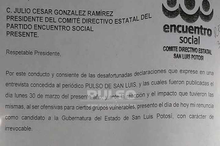 NOTICIAS 01/04/2015Renuncia candidato a la gubernaturaArturo Arriaga Macías renunció a la candidatura de gobernador de San Luis Potosí por el partido Encuentro Social, tras las declaraciones que dio al diario Pulso de San Luis donde comparó la problemática del narcotráfico, la inseguridad y el desempleo con la homosexualidad.