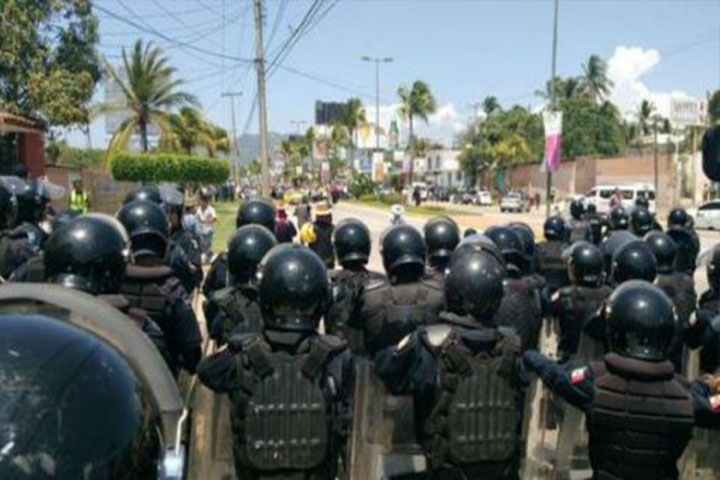 NOTICIAS 24/03/2015Antimotines frenan paso de CETEG a Tianguis TurísticoElementos antimotines de la Policía Federal frenaron el paso de la marcha de maestros de la Coordinadora Estatal de Trabajadores de la Educación en Guerrero, familiares de los normalistas desaparecidos y organizaciones civiles, hacia la expo Mundo Imperial, donde se realiza el Tianguis Turístico 2015.