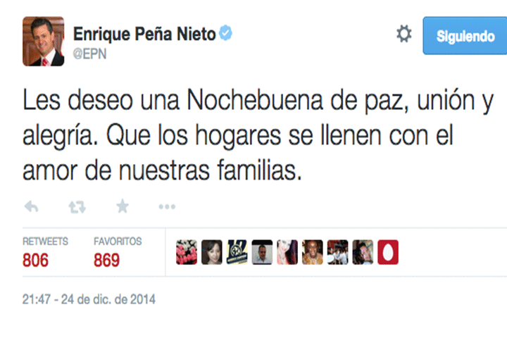 NOTICIAS 25/12/2014Mensaje de navidad en Twitter del Presidente PeñaLa noche del 24 de diciembre, con motivo de Navidad, el Presidente de México, Enrique Peña Nieto emitió un mensaje en su cuenta de Twitter.