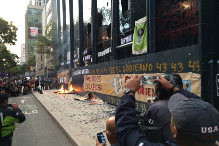 NOTICIAS 15/10/2014Estudiantes apedrean la PGR para exigir la aparición de normalistasLa concentración que realizaron estudiantes de la UNAM, UAM y UACM entre otras instituciones frente a las instalaciones de la Procuraduría General de la República (PGR) en reclamo por la desaparición de 43 normalistas de Ayotzinapa, desde el pasado 26 de septiembre, concluyó con pedradas a la sede de la dependencia federal, vidrios rotos y pintas.
