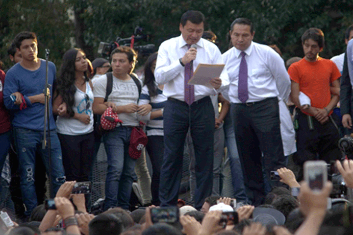 Bajo una pertinaz lluvia y en un templete instalado ante miles de estudiantes, el Secretario de Gobernación, Miguel Ángel Osorio Chong, dio respuesta a cada uno de los 10 puntos que el movimiento estudiantil le planteó al ... Ver más...