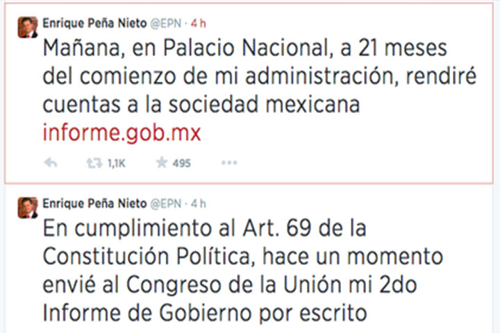 "Mañana, en Palacio Nacional, a 21 meses del comienzo de mi administración, rendiré cuentas a la sociedad mexicana", escribió en su cuenta @EPN de Twitter.
