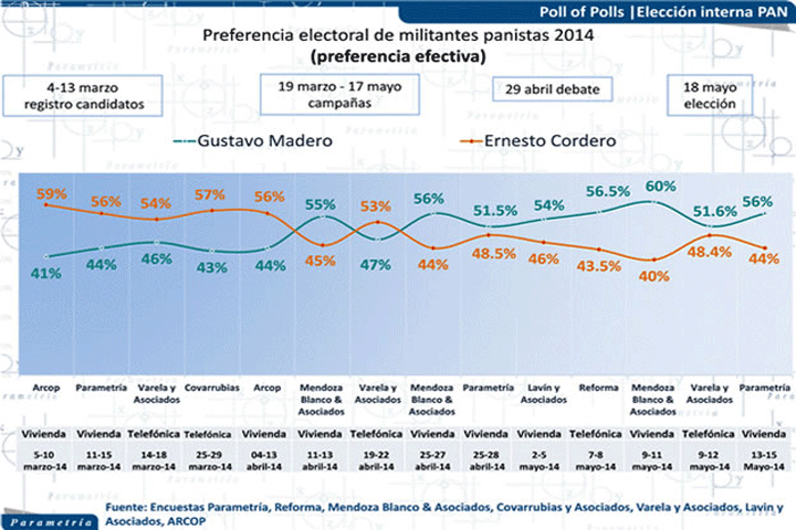 NOTICIAS 18/05/2014Encuesta de encuestas le da el triunfo a MaderoGustavo Madero lleva ventaja sobre Ernesto Cordero en las encuestas de cara a la elección interna por la dirigencia nacional del PAN, a celebrarse este domingo.
