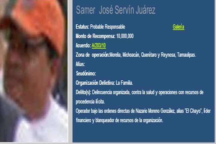 La Procuraduría General de la República (PGR) confirmó la muerte de Samer José Servín Juárez, considerado por las autoridades federales como uno de los principales operadores financieros del grupo delictivo "Los Caballeros Templarios", el cual estaba bajo el mando directo de Servando Gómez Martínez, alias "La Tuta".
