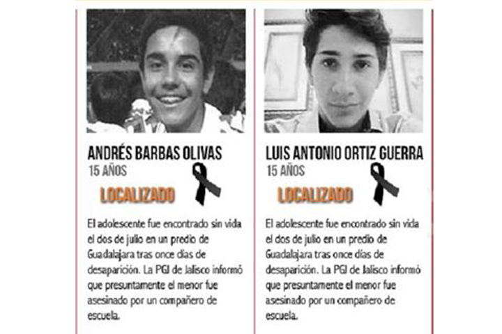 NOTICIAS 02/07/2013Autoridades confirman muerte de dos jóvenes desaparecidos en JaliscoLos jóvenes desaparecidos el 21 de junio pasado tras retirarse del centro comercial Ciudadela, en Zapopan. El titular de la dependencia indicó que los jóvenes fueron llevados a una finca localizada dentro del rancho La Cebada donde fueron privados de su libertad y posteriormente privados de la vida.