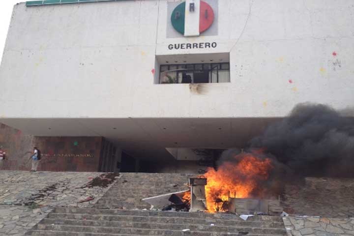 Seguidores del Movimiento Popular Guerrerense y de la Coordinadora Estatal de Trabajadores de la Educación de Guerrero destruyeron las instalaciones del PAN y Movimiento Ciudadano, PRD y PRI en Chilpancingo, Guerrero.