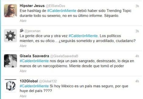 NOTICIAS 04/09/2012Twitteros se mofan de Felipe Calderón con el hashtag #CalderónMiente y #PideCalderónEl mensaje emitido por el presidente Felipe Calderón acaparó la atención de los usuarios de las redes sociales, principalmente de Twitter en donde nueve diferentes hashtags y frases sobre el tema lograron colocarse en la lista de Trending Topic; sobresaliendo #CalderónMiente el cual fue la primera tendencia más tuiteada en México durante las dos horas que duró el informe.