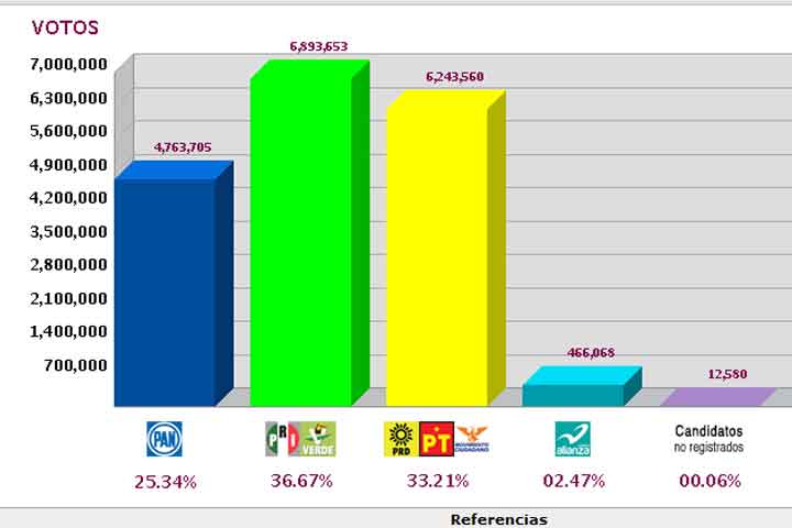NOTICIAS 01/07/2012Tiene Peña Nieto ventaja en conteo rápido: IFEEnrique Peña Nieto, candidato de la coalición Compromiso por México es el ganador en el conteo rápido del IFE con un 37.93 y 38.55 por ciento de los votos, mientras que Andrés Manuel López Obrador de la coalición Movimiento progresista obtuvo un segundo lugar con un porcentaje que oscila entre el 30.90 y 31.86; Josefina Vázquez Mota de Acción Nacional obtuvo un tercer lugar con un porcentaje entre 25.10 y 26.03; y finalmente Gabriel Cua... Ver más...