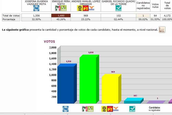 NOTICIAS 01/07/2012Peña Nieto aventaja elección presidencial: PREP El candidato Enrique Peña Nieto, del Partido Revolucionario Institucional (PRI), contaba con una ventaja irreversible que lo ubicaba como el ganador de las elecciones a la Presidencia de la República, de acuerdo con encuestas de salida dadas a conocer hasta las 20:00 horas de hoy, que además daban el segundo sitio al abanderado de las izquierdas, Andrés Manuel López Obrador.