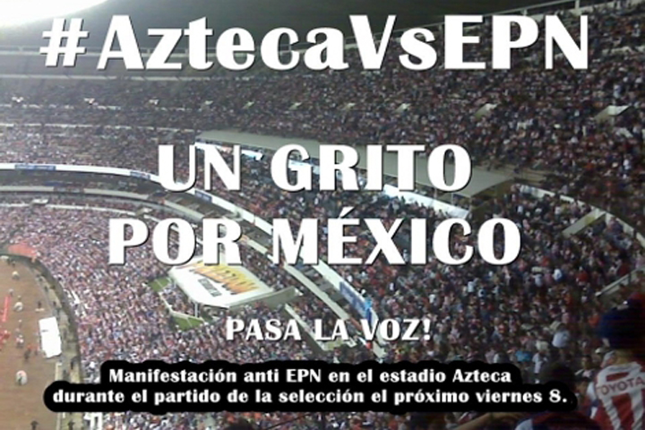 NOTICIAS 04/06/2012Usuarios de redes sociales organizan protesta contra Peña Nieto en el AztecaA través de Facebook y Twitter usuarios están organizando una protesta en contra del candidato del PRI Enrique Peña Nieto, durante el partido de futbol entre la selección mexicana y la de Guyana, que se jugará en el Estadio Azteca el próximo viernes 8 de junio a las 19:00 horas.